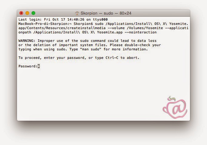 sudo /Applications/Install\ OS\ X\ Yosemite.app/Contents/Resources/createinstallmedia --volume /Volumes/Yosemite --applicationpath /Applications/Install\ OS\ X\ Yosemite.app --nointeraction